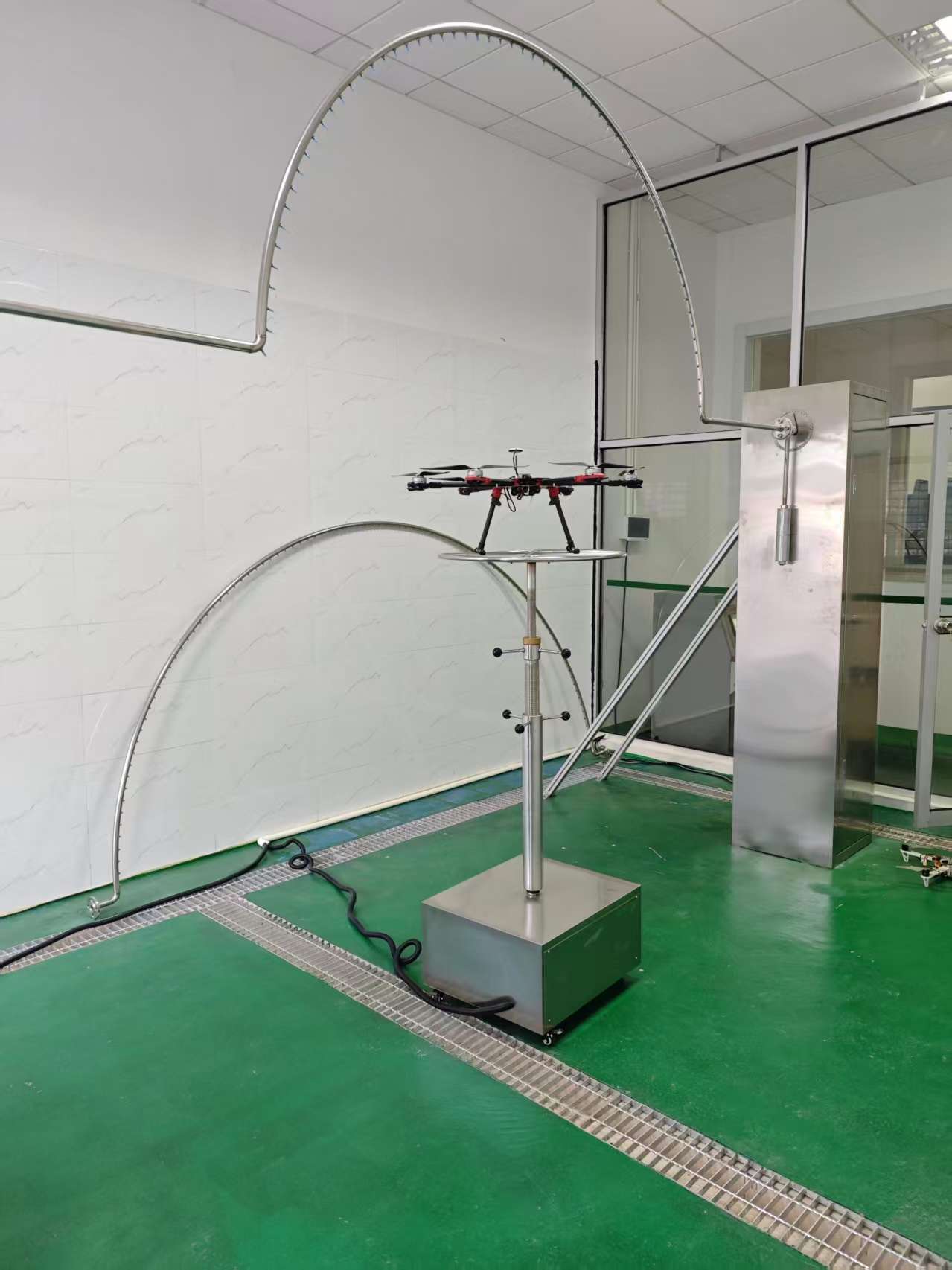 无人机防水性实验装置用于在使用过程中可能会受到雨水喷淋的民用轻小型无人机系统,以此确定民用轻小型无人机系统是否能经受住喷洒或滴落到其表面上的雨水环境的影响。