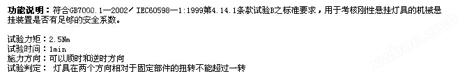 刚性悬挂灯具扭矩试验参数: 试验力矩:2.5Nm 试验时间:1min 施力方向:可以顺时和逆市方向 刚性悬挂灯具扭矩试验