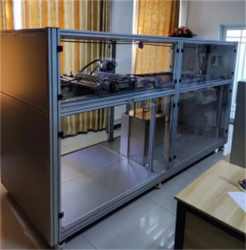 3.2、整体采用透明的、密封外壳框架式结构,仪器造型美观大方、隔音效果强,试验过程安全性稳定性高。仪器试验过程中产生的仪器外部配有铝合金框架+有机玻璃保护罩,测试时必须关闭全部安全保护门,在测试过程中,如打开安全门,机械机构将自动全部暂停,以确保测试人员的生命安全。