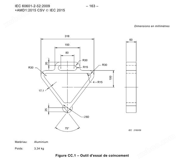 主要参数规格:楔形工具是根据IEC60601-2-52CC.1要求设计制作而成,用于评估医疗器械的V型开口风险程度,被测区域是BCV形开口,本三角形测试工具材质为铝,重量3.34kg.