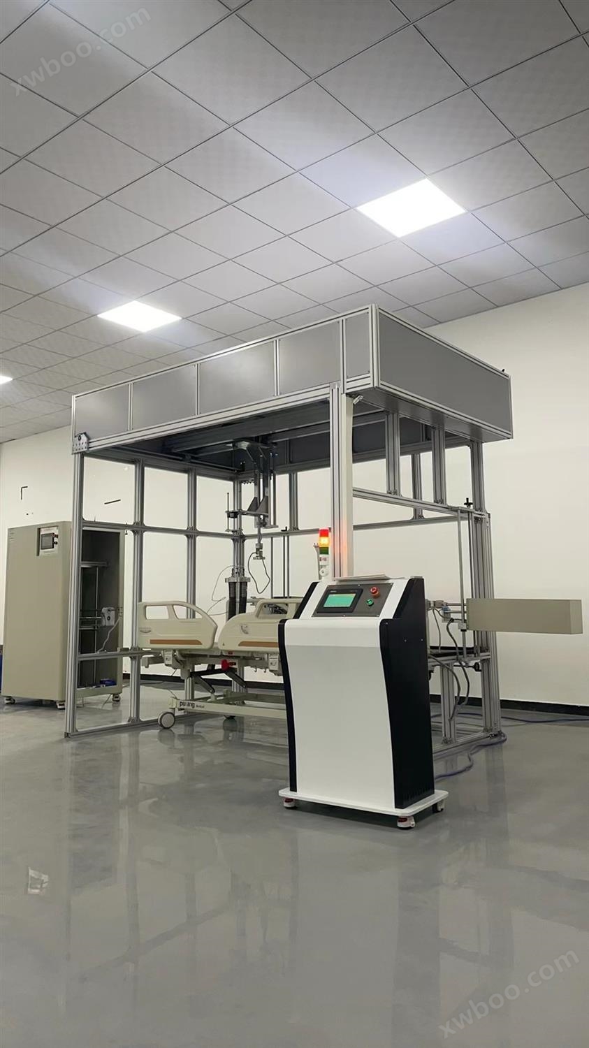 201.9.8.3.3.3“边栏强度和栓锁可靠性依据YY9706.252-2021《医用电气设备第2-52部分:医用病床的基本安全和基本性能专用要求》标准中第201.9.8.3.3.3“边栏强度和栓锁可靠性”要求设计制作。适用于测试医用病床、老人護理床,中医理疗床等产品之负载、护栏推拉强度试验、拉伸杆动态载荷疲劳试验。模拟床在负载情况的强度和护栏推拉强度和拉伸杆动态强度试验。