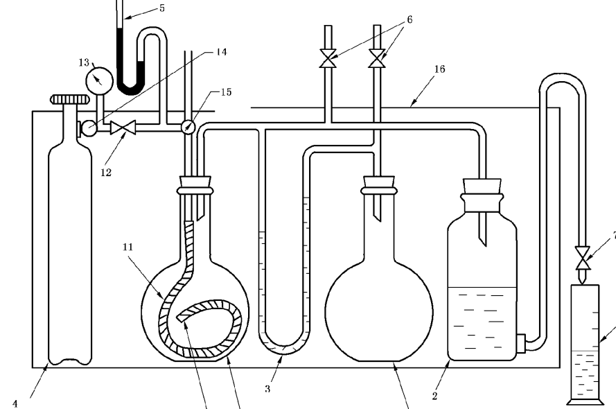 瓶和配管部分放在35C士0.5。C的恒温室中,试验装置见图D.1。