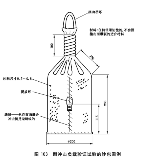 将质量为 15 kg 装有干沙的沙包,如图 103 所示,垂直悬吊在被试物的上方,并且应高于该成套设