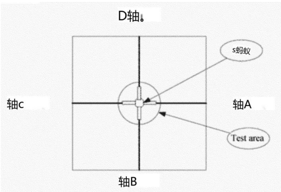 将多头吊扇悬挂在天花板上,使其中一个吊扇头位于 传感器 1 的正上方(即,位于轴 A、B、C 和 D 的交点 处)。居中式吊扇扇叶所能达到的最低点与风速传感器 之间的距离应与所有其他小直径吊扇的相同(参见本附 录图3)。如果多头吊扇具有可关闭的摆动功能(即, 扇叶相对于天花板改变其旋转轴),请在测量风速之前 将其关闭。如果任何多头吊扇未预装叶片,则仅将叶片 安装在位于传感器轴线交点正上方的扇叶上。(即使多 头吊扇的扇叶通常在所有扇叶都安装叶片时都会摆动, 但如果居中式吊扇是唯一安装叶片的扇叶时不摆动,则 该吊扇仍需接受此测试程序。)如果所有扇叶均已预装 叶片,则请按照本附录第3.3节测量风速,但只需打开居 中式吊扇即可。在所有风扇头上安装风扇叶片并打开任 何振荡功能(如果有)的情况下,分别进行功耗测量。 3.2.4. 气流不直接向下的吊扇的测试设置 对于气流并非直接向下的吊扇,在测试之前,请调整 吊扇头,使气流尽可能垂直。对于无法实现完全垂直气 流方向的吊扇,请调整吊扇(或风扇头,如果吊扇是多 头风扇)的方向,使任何剩余的倾斜都与四个传感器轴 线之一对齐。不是只测量吊扇正下方的传感器的风速, 而是要测量沿该轴线的所有传感器的风速,以及相对于 该轴线成 180 度方向的轴线的风速。例如,如果倾斜方 向沿 A 轴,则要测量沿 A-C 轴的所有传感器的风速。